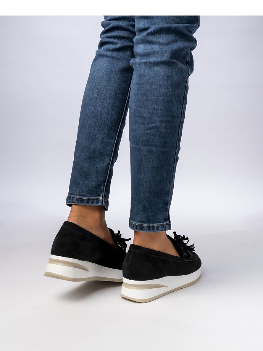 Women’s platform moccasins in an elegant, classic black color. Made of high-quality suede, they provide softness and comfort during use. The model stands out with trendy fringes on the front and a light, flexible sole that gives them a modern character. Perfect for everyday and elegant stylizations.