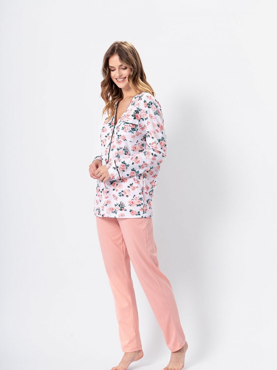 Unbuttoned women’s pajamas Dalia is a stylish and comfortable set that will delight even the most discriminating tastes. There is a contrast piping on the neckline, which is arranged in a delicate heart shape, adding originality and character. The blouse is buttoned and has long sleeves with a cuff, also decorated with a contrast piping. It is made of soft knit fabric in a floral pattern with a rose motif, giving it a romantic touch. The pants are long and peach-colored, forming a harmonious whole with the upper part of the pajamas. The whole set is made of 100% cotton, which ensures a feeling of comfort, softness and good air circulation. This unbuttoned pajama set is an ideal choice for those who appreciate both style and comfort. Enjoy the relaxation and pleasure of sleep in these lovely pajamas.