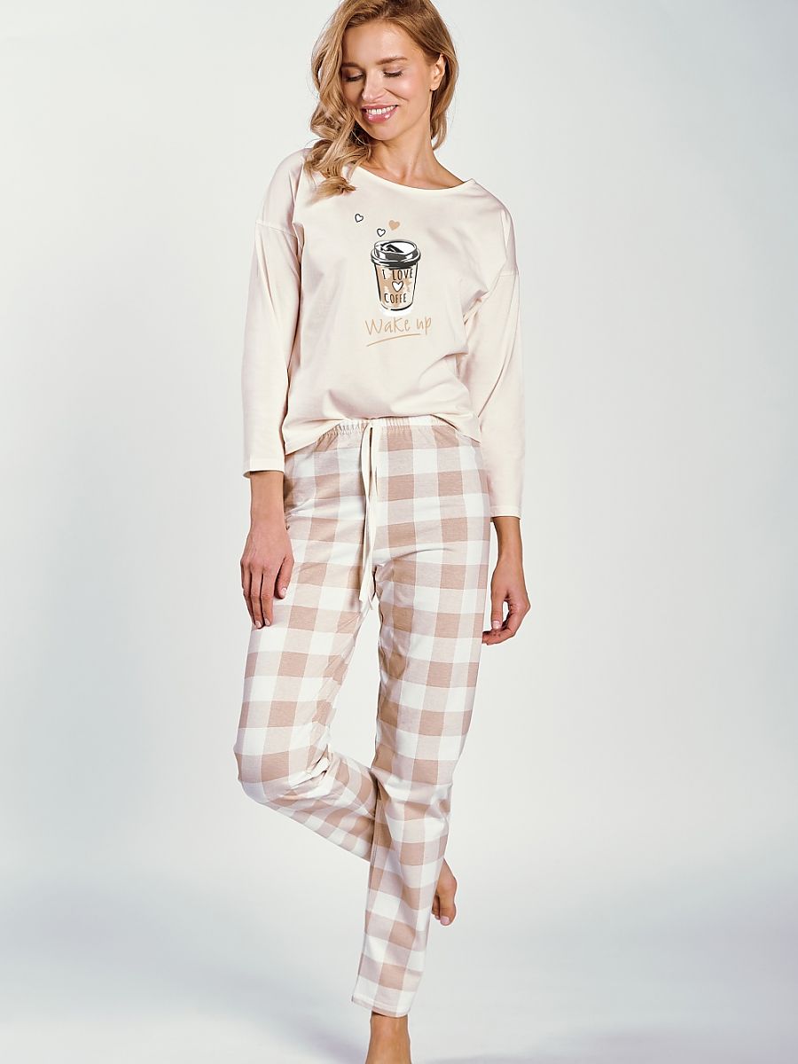 Women’s pajamas for comfort and style consist of a 3/4 sleeve blouse and long pants. The blouse has a half-circle neckline and a delicate print at the top, adding subtle elegance. The loose, comfortable cut and soft and airy fabric make the pajamas ideal for sleeping. The long pants without pockets, with a drawstring waist and elastic waistband, guarantee a perfect fit and comfortable wear. This combination of comfort and style makes the pajamas a great choice for any night out.