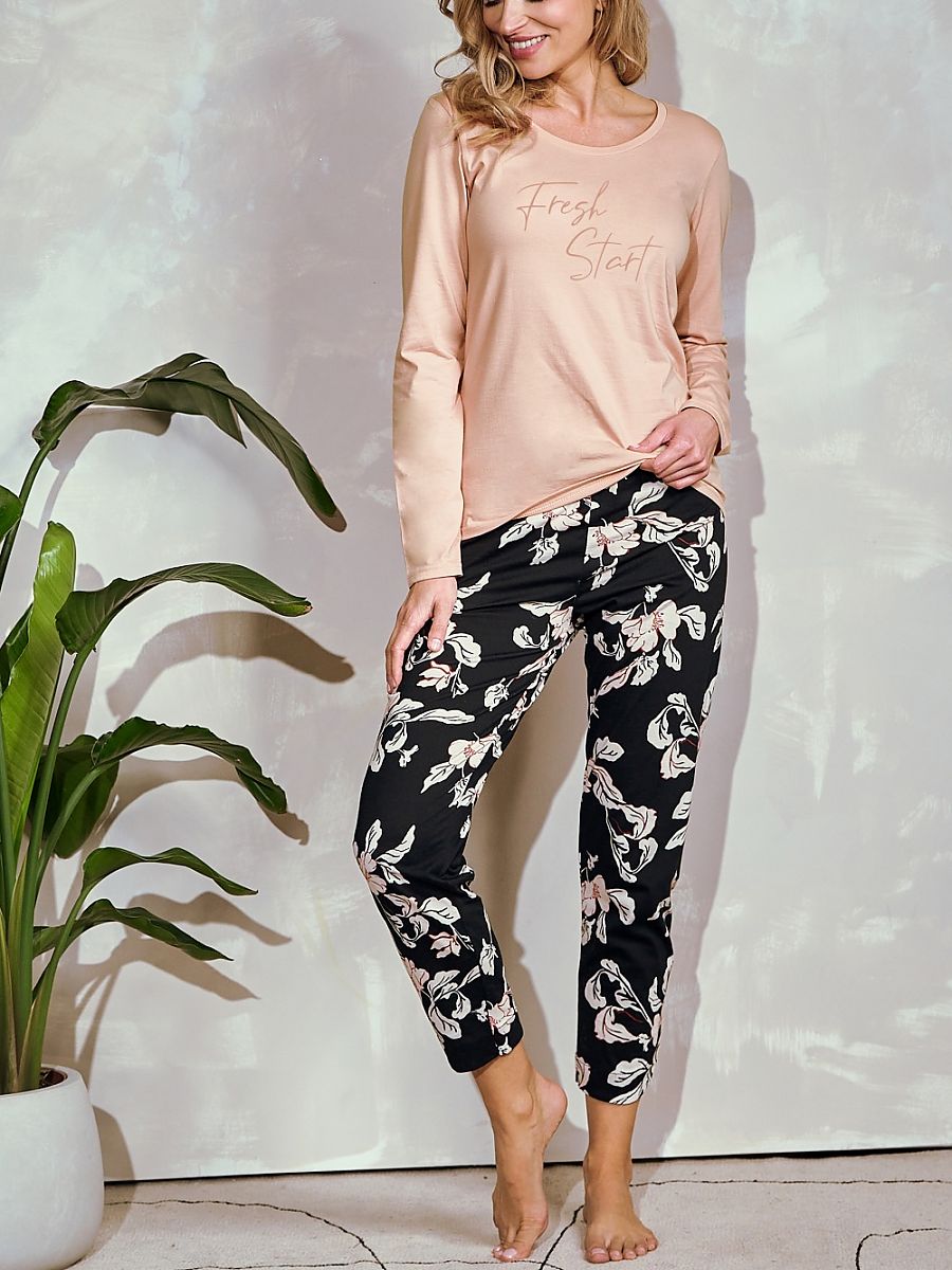 Women’s pajamas ideal for cooler nights. It consists of a long-sleeved blouse and long pants. The blouse has a semi-circular neckline and a delicate print at the top, adding subtle elegance. Soft and comfortable, it is perfect as a comfortable sleepwear. The pocketless pants have a long cut and a decorative print, which creates a cohesive, stylish whole. The elastic waistband guarantees a perfect fit and comfortable wearing all night long. This combination of comfort and style makes these pajamas a great choice for any night out.