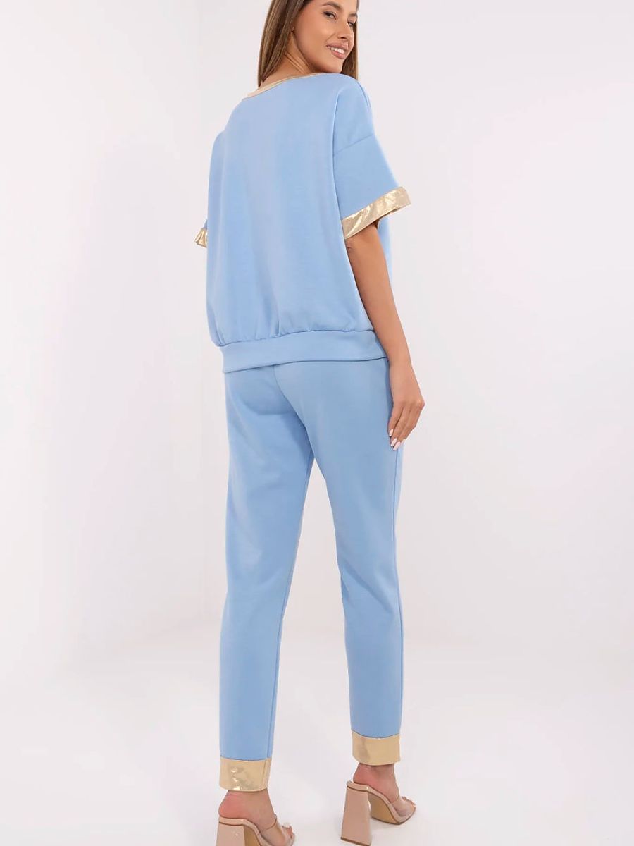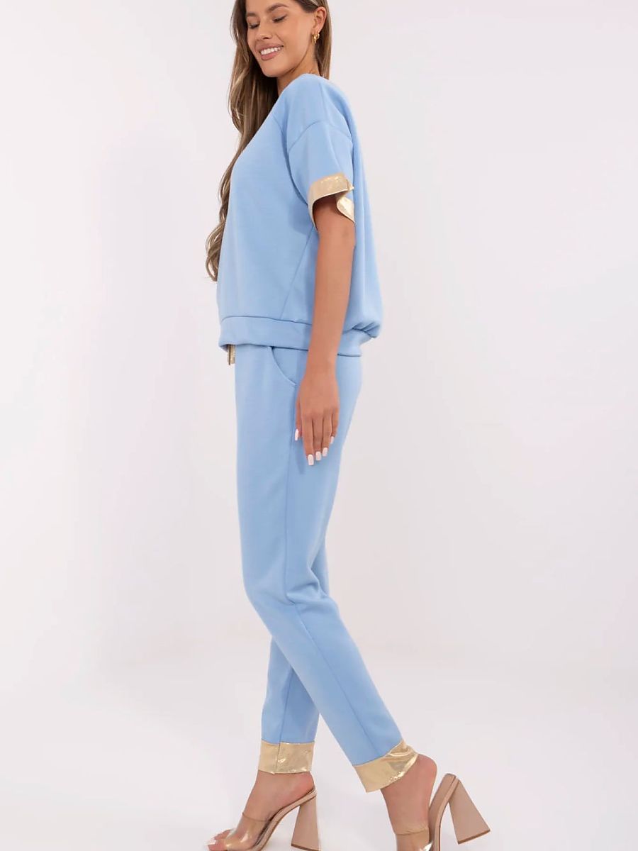 Stylish and comfortable women’s set, perfect for everyday wear. Made of high-quality blend of viscose, cotton and elastane, it ensures comfort and freedom of movement. The smooth fabric gives it an elegant minimalism, and the gold finishes on the cuffs, sleeves and neckline add subtle chic. The blouse has short sleeves and a classic round neckline, while the high-waisted pants with side slip pockets provide comfort and practicality. The long legs finished with ribbons emphasize the casual character of the set. An ideal choice for women who appreciate style and comfort in their everyday outfits.