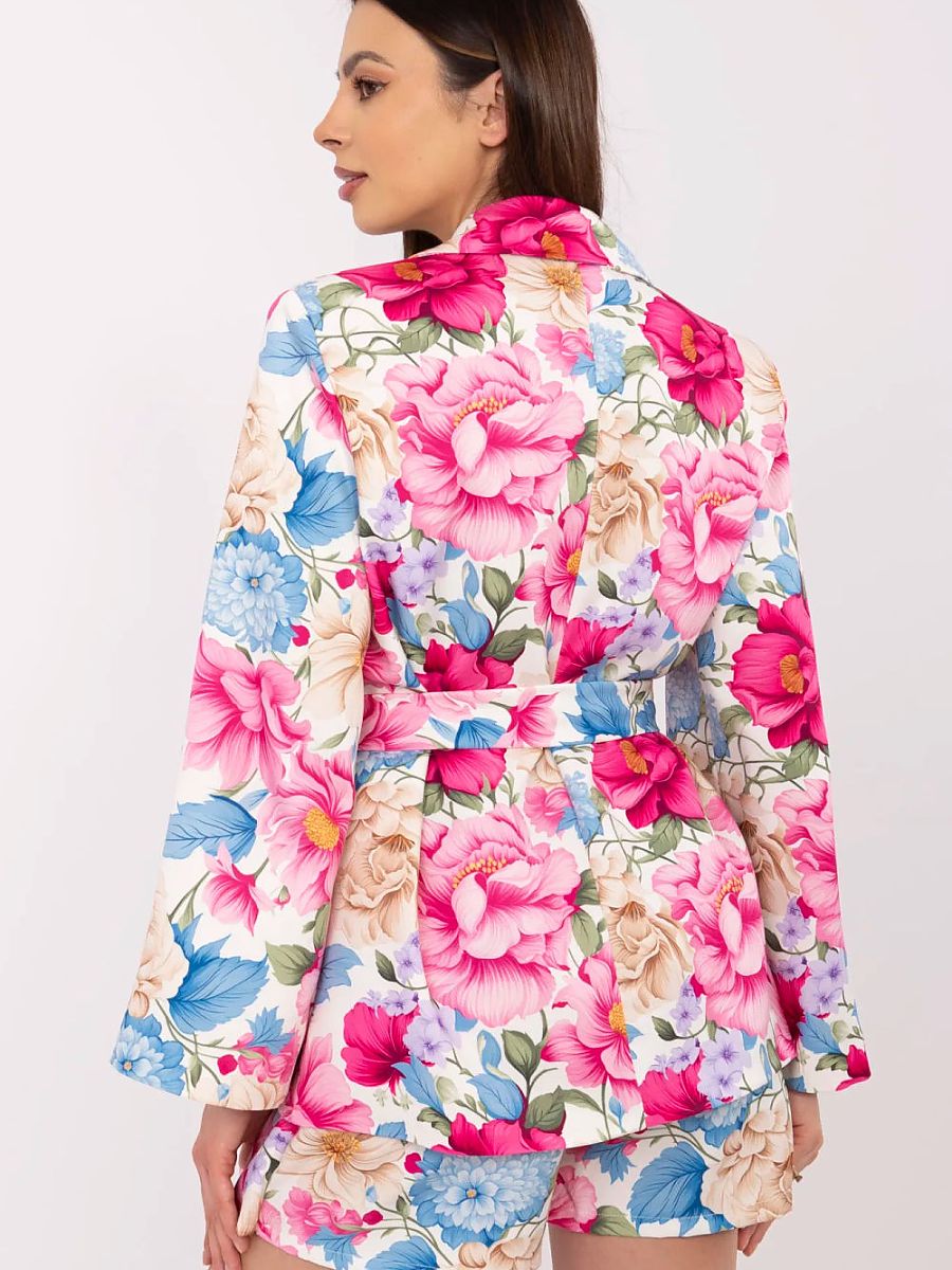 A women’s complete outfit consisting of a blazer and shorts is an ideal proposal for any occasion, from everyday outings, through work, to elegant receptions. The floral pattern gives the set a subtle freshness, while the elegant cut emphasizes the silhouette. The long-sleeved blazer with lapels and a button closure has been enhanced with sewn-in shoulder pads that beautifully shape the line of the shoulders. The included tie belt allows for a tailored fit and adds an individual character to the styling. The high-waisted shorts combine the feminine look of a skirt with the comfort of shorts. The pleated front and elegant belt fastened at the waist create a striking accent and slim the silhouette. The absence of pockets adds lightness and an elegant finish to the whole. Made from a combination of polyester and elastane, this set ensures comfort of wear and a perfect appearance throughout the day.